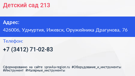 Детский сад №213 по адресу 426006, Удмуртия, Ижевск, Оружейника Драгунова, 76 в дальнейшем Организация, размещена в следующих категориях: