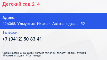 Детский сад №214 по адресу 426068, Удмуртия, Ижевск, Автозаводская, 52 в дальнейшем Организация, размещена в следующих категориях:
