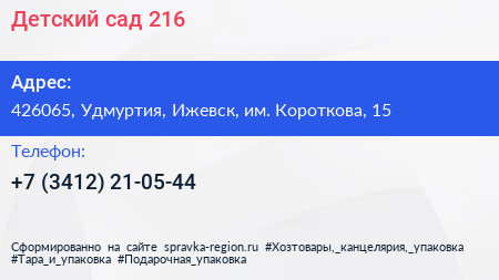 Детский сад №216 по адресу 426065, Удмуртия, Ижевск, им. Короткова, 15 в дальнейшем Организация, размещена в следующих категориях: