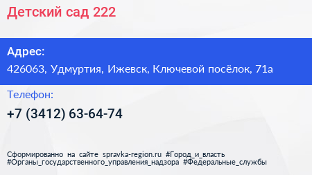 Детский сад №222 по адресу 426063, Удмуртия, Ижевск, Ключевой посёлок, 71а в дальнейшем Организация, размещена в следующих категориях: