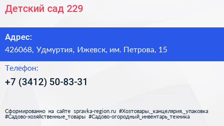 Детский сад №229 по адресу 426068, Удмуртия, Ижевск, им. Петрова, 15 в дальнейшем Организация, размещена в следующих категориях: