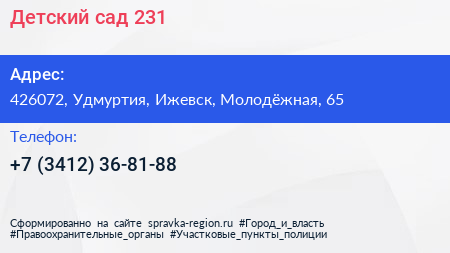 Детский сад №231 по адресу 426072, Удмуртия, Ижевск, Молодёжная, 65 в дальнейшем Организация, размещена в следующих категориях: