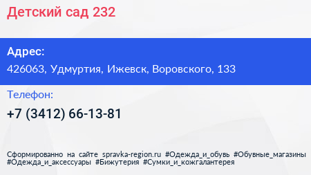 Детский сад №232 по адресу 426063, Удмуртия, Ижевск, Воровского, 133 в дальнейшем Организация, размещена в следующих категориях: