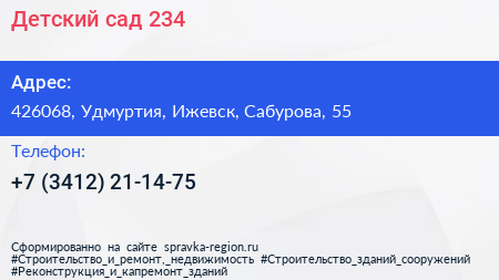Детский сад №234 по адресу 426068, Удмуртия, Ижевск, Сабурова, 55 в дальнейшем Организация, размещена в следующих категориях: