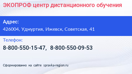 ЭКОПРОФ, центр дистанционного обучения по адресу 426004, Удмуртия, Ижевск, Советская, 41 в дальнейшем Организация, размещена в следующих категориях: