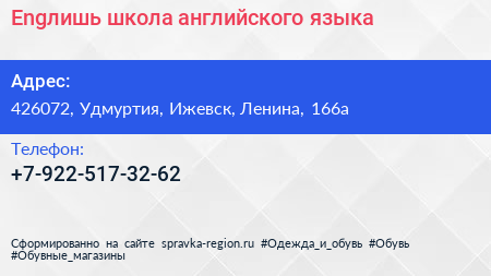 Engлишь, школа английского языка по адресу 426072, Удмуртия, Ижевск, Ленина, 166а в дальнейшем Организация, размещена в следующих категориях:
