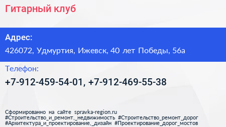 Гитарный клуб по адресу 426072, Удмуртия, Ижевск, 40 лет Победы, 56а в дальнейшем Организация, размещена в следующих категориях: