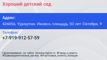 Хороший детский сад по адресу 426056, Удмуртия, Ижевск, площадь 50 лет Октября, 9 в дальнейшем Организация, размещена в следующих категориях: