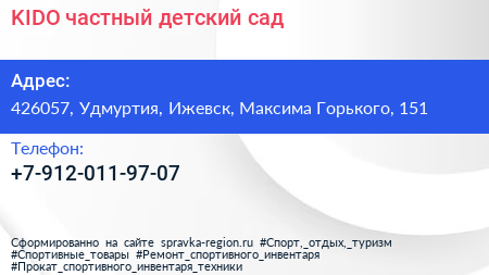 KIDO, частный детский сад по адресу 426057, Удмуртия, Ижевск, Максима Горького, 151 в дальнейшем Организация, размещена в следующих категориях: