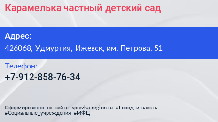 Карамелька, частный детский сад по адресу 426068, Удмуртия, Ижевск, им. Петрова, 51 в дальнейшем Организация, размещена в следующих категориях: