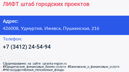 ЛИФТ, штаб городских проектов по адресу 426008, Удмуртия, Ижевск, Пушкинская, 216 в дальнейшем Организация, размещена в следующих категориях: