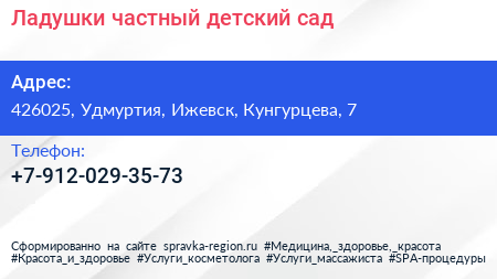 Ладушки, частный детский сад по адресу 426025, Удмуртия, Ижевск, Кунгурцева, 7 в дальнейшем Организация, размещена в следующих категориях: