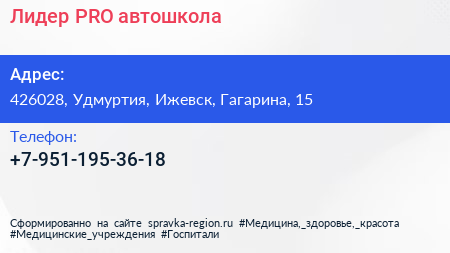 Лидер PRO, автошкола по адресу 426028, Удмуртия, Ижевск, Гагарина, 15 в дальнейшем Организация, размещена в следующих категориях: