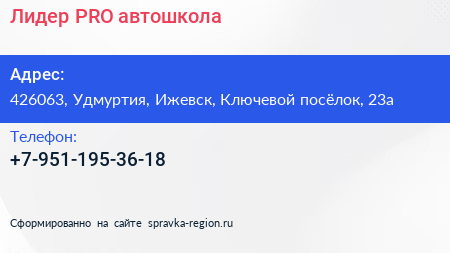 Лидер PRO, автошкола по адресу 426063, Удмуртия, Ижевск, Ключевой посёлок, 23а в дальнейшем Организация, размещена в следующих категориях: