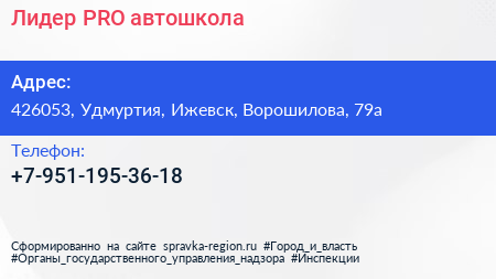 Лидер PRO, автошкола по адресу 426053, Удмуртия, Ижевск, Ворошилова, 79а в дальнейшем Организация, размещена в следующих категориях: