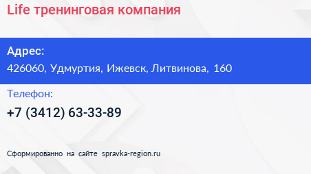 Life, тренинговая компания по адресу 426060, Удмуртия, Ижевск, Литвинова, 160 в дальнейшем Организация, размещена в следующих категориях: