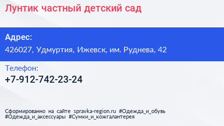 Лунтик, частный детский сад по адресу 426027, Удмуртия, Ижевск, им. Руднева, 42 в дальнейшем Организация, размещена в следующих категориях: