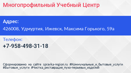 Многопрофильный Учебный Центр по адресу 426008, Удмуртия, Ижевск, Максима Горького, 59а в дальнейшем Организация, размещена в следующих категориях: