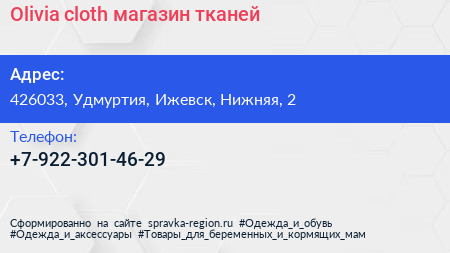 Olivia cloth, магазин тканей по адресу 426033, Удмуртия, Ижевск, Нижняя, 2 в дальнейшем Организация, размещена в следующих категориях: