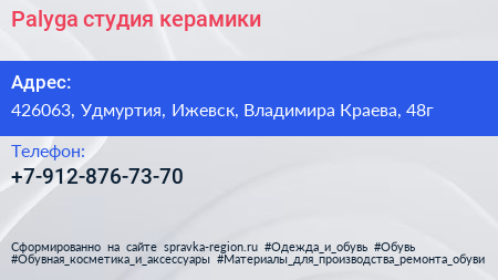 Palyga, студия керамики по адресу 426063, Удмуртия, Ижевск, Владимира Краева, 48г в дальнейшем Организация, размещена в следующих категориях:
