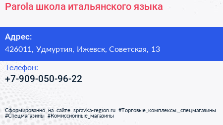 Parola, школа итальянского языка по адресу 426011, Удмуртия, Ижевск, Советская, 13 в дальнейшем Организация, размещена в следующих категориях: