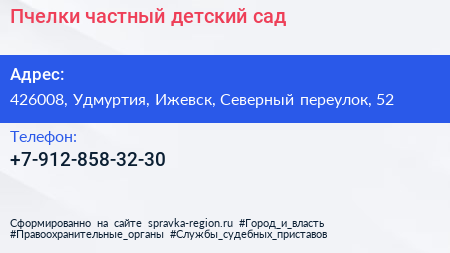 Пчелки, частный детский сад по адресу 426008, Удмуртия, Ижевск, Северный переулок, 52 в дальнейшем Организация, размещена в следующих категориях:
