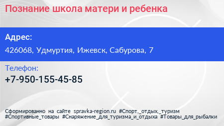 Познание, школа матери и ребенка по адресу 426068, Удмуртия, Ижевск, Сабурова, 7 в дальнейшем Организация, размещена в следующих категориях: