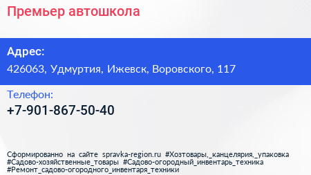 Премьер, автошкола по адресу 426063, Удмуртия, Ижевск, Воровского, 117 в дальнейшем Организация, размещена в следующих категориях: