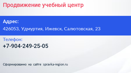 Продвижение, учебный центр по адресу 426053, Удмуртия, Ижевск, Салютовская, 23 в дальнейшем Организация, размещена в следующих категориях: