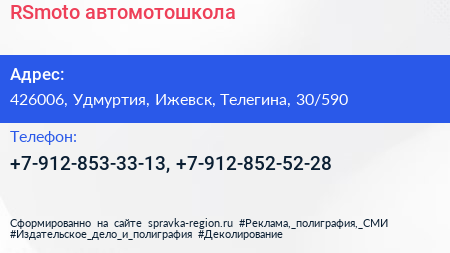 RSmoto, автомотошкола по адресу 426006, Удмуртия, Ижевск, Телегина, 30/590 в дальнейшем Организация, размещена в следующих категориях: