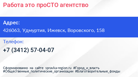 Работа-это проСТО, агентство по адресу 426063, Удмуртия, Ижевск, Воровского, 158 в дальнейшем Организация, размещена в следующих категориях: