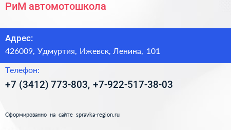 РиМ, автомотошкола по адресу 426009, Удмуртия, Ижевск, Ленина, 101 в дальнейшем Организация, размещена в следующих категориях: