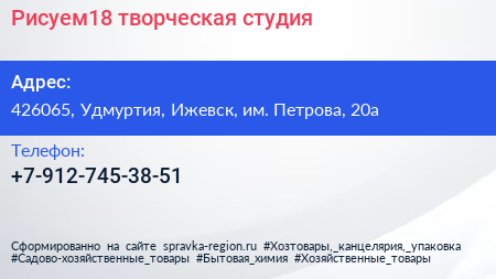 Рисуем18, творческая студия по адресу 426065, Удмуртия, Ижевск, им. Петрова, 20а в дальнейшем Организация, размещена в следующих категориях: