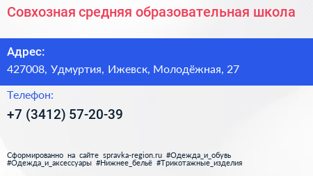 Совхозная средняя образовательная школа по адресу 427008, Удмуртия, Ижевск, Молодёжная, 27 в дальнейшем Организация, размещена в следующих категориях: