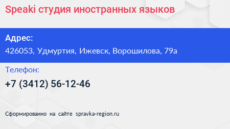 Speaki!, студия иностранных языков по адресу 426053, Удмуртия, Ижевск, Ворошилова, 79а в дальнейшем Организация, размещена в следующих категориях: