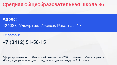 Средняя общеобразовательная школа №36 по адресу 426038, Удмуртия, Ижевск, Ракетная, 17 в дальнейшем Организация, размещена в следующих категориях: