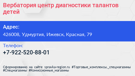 Вербатория, центр диагностики талантов детей по адресу 426008, Удмуртия, Ижевск, Красная, 79 в дальнейшем Организация, размещена в следующих категориях: