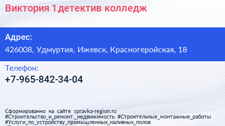Виктория-1, детектив-колледж по адресу 426008, Удмуртия, Ижевск, Красногеройская, 18 в дальнейшем Организация, размещена в следующих категориях: