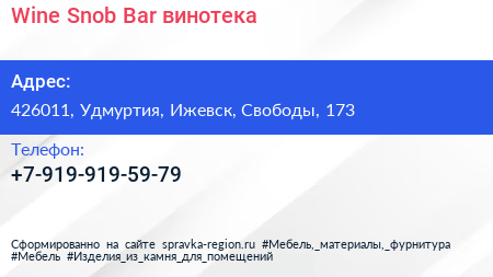 Wine Snob Bar, винотека по адресу 426011, Удмуртия, Ижевск, Свободы, 173 в дальнейшем Организация, размещена в следующих категориях: