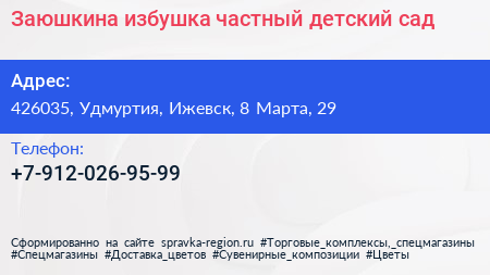 Заюшкина избушка, частный детский сад по адресу 426035, Удмуртия, Ижевск, 8 Марта, 29 в дальнейшем Организация, размещена в следующих категориях: