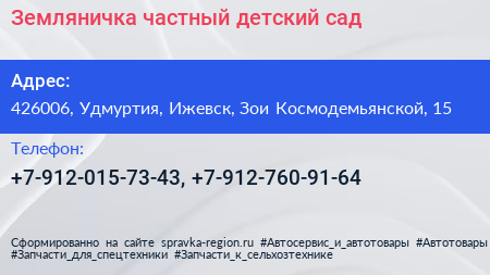 Земляничка, частный детский сад по адресу 426006, Удмуртия, Ижевск, Зои Космодемьянской, 15 в дальнейшем Организация, размещена в следующих категориях: