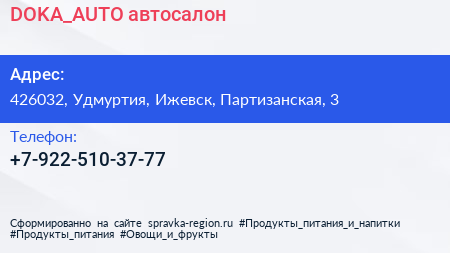 DOKA_AUTO, автосалон по адресу 426032, Удмуртия, Ижевск, Партизанская, 3 в дальнейшем Организация, размещена в следующих категориях: