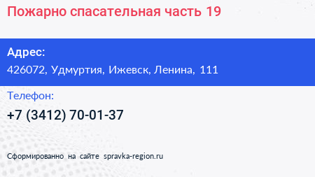 Пожарно-спасательная часть №19 по адресу 426072, Удмуртия, Ижевск, Ленина, 111 в дальнейшем Организация, размещена в следующих категориях: