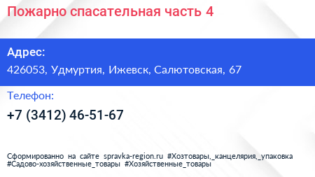 Пожарно-спасательная часть №4 по адресу 426053, Удмуртия, Ижевск, Салютовская, 67 в дальнейшем Организация, размещена в следующих категориях: