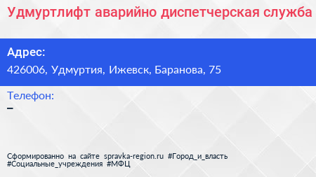 Удмуртлифт, аварийно-диспетчерская служба по адресу 426006, Удмуртия, Ижевск, Баранова, 75 в дальнейшем Организация, размещена в следующих категориях: