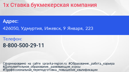 1х Ставка, букмекерская компания по адресу 426050, Удмуртия, Ижевск, 9 Января, 223 в дальнейшем Организация, размещена в следующих категориях: