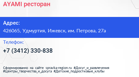 AYAMI, ресторан по адресу 426065, Удмуртия, Ижевск, им. Петрова, 27а в дальнейшем Организация, размещена в следующих категориях: