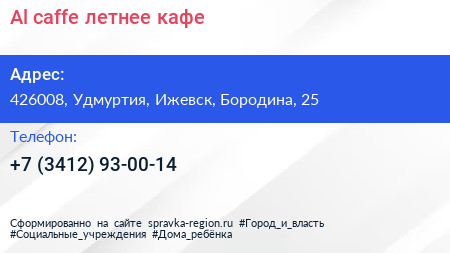 Al caffe, летнее кафе по адресу 426008, Удмуртия, Ижевск, Бородина, 25 в дальнейшем Организация, размещена в следующих категориях: