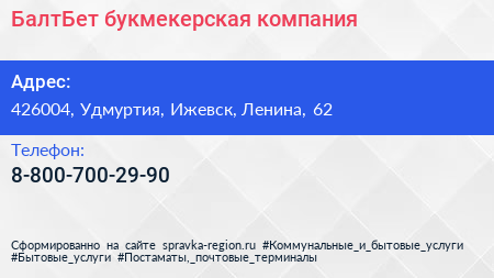 БалтБет, букмекерская компания по адресу 426004, Удмуртия, Ижевск, Ленина, 62 в дальнейшем Организация, размещена в следующих категориях: