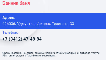 Банник, баня по адресу 426006, Удмуртия, Ижевск, Телегина, 30 в дальнейшем Организация, размещена в следующих категориях: